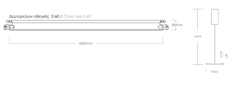 Κατάλληλος για το εμφανές σύστημα ανάρτησης Hook. Σε συνδυασμό με τον κύριο και τον δευτερεύοντα οδηγό 1,20m, δημιουργεί κάναβο διαστάσεων 60x60cm. Οι κύριοι και οι εγκάρσιοι οδηγοί ύψους 38mm, και πλάτους 15mm, με σύστημα σύνδεσης Ηοοκ, τοποθετούνται εύκολα, γρήγορα και αποτρέπουν την στρέψη. Μπορούν να αποσυναρμολογηθούν και να συναρμολογηθούν αρκετές φορές, χωρίς να καταστρέφονται και χωρίς την χρήση εργαλείων .