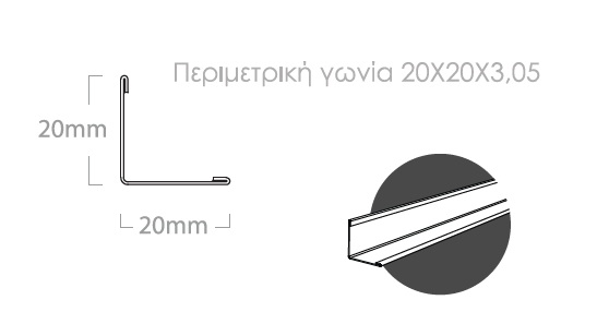 Γωνία περιμετρική σχήματος L, διατομής 20x20mm, χρώματος λευκού (RAL 9006), κατά ΕΝ 13964, μήκος 3,05m/τεμάχιο.