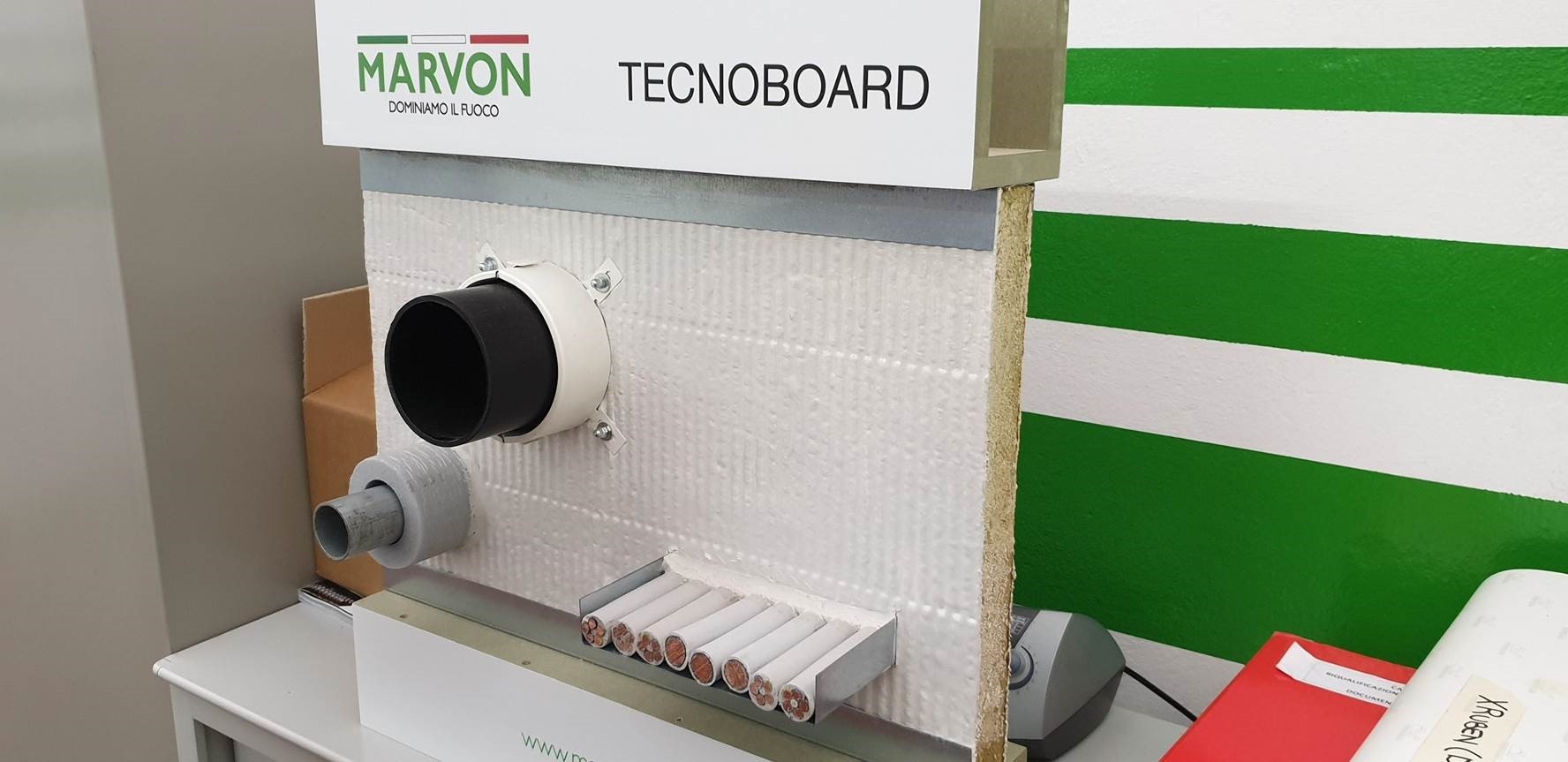 Το TECNOBOARD πάνελ πυροπροστασίας, αποτελείται από πλάκες πετροβάμβακα επενδυμένες και στις δύο πλευρές τους με λευκή διογκωμένη βαφή επικάλυψης. Σε επαφή με τη φωτιά, η επικάλυψη των πλακών αντιδρά και η συγκεκριμένη βαφή διογκώνεται, αποτρέποντας κάθε πιθανό πέρασμα της φλόγας, μέσω του δομικού στοιχείου. Ταυτόχρονα, η τοποθέτηση του στα διάφορα πιθανά πύρινα περάσματα, βελτιώνει την συνολική θερμομόνωση της κατασκευής. Τα τυχόν κενά που μπορεί να προκύψουν μεταξύ των πάνελ, κατά την τοποθέτηση τους, καθώς και τα κενά μεταξύ των πάνελ και της περιμέτρου των σωληνώσεων, καλύπτονται με την χρήση ειδικού σφραγιστικού ακρυλικής βάσης.